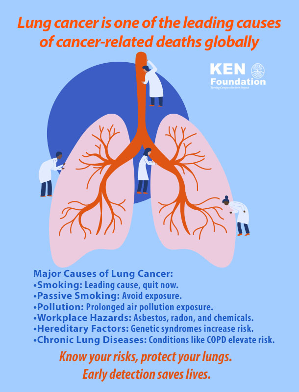 Lung cancer is a critical public health issue, but with increased awareness and proactive measures, we can make a difference. This World Lung Cancer Day, join Ken Foundation in spreading knowledge about lung cancer's causes and prevention. Know your risks, protect your lungs, and remember that early detection saves lives.